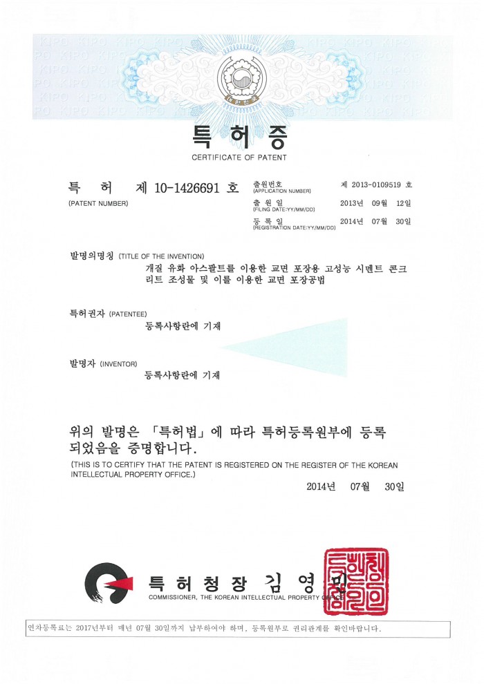 특허증 제10-1426691호 개질 유화 아스팔트를 이용한 교면 포장용 고성능 시멘트 콘크리트 조성물 페이지 정보 글쓴이 관리자 조회 652 등록일 time18-01-12 15:52 댓글 0건 관련링크 이전글 다음글 목록 답변 본문 특허증 제10-1426691호 개질 유화 아스팔트를 이용한 교면 포장용 고성능 시멘트 콘크리트 조성물 이전글 다음글 목록 답변
