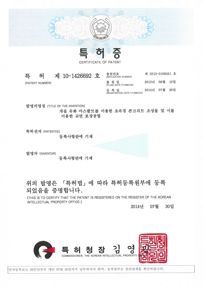 특허증 제10-1426692호 개질 유화 아스팔트를 이용한 초속경 콘크리트 조성물 페이지 정보 글쓴이 관리자 조회 639 등록일 time18-01-12 15:53 댓글 0건 관련링크 이전글 다음글 목록 답변 본문 특허증 제10-1426692호 개질 유화 아스팔트를 이용한 초속경 콘크리트 조성물 이전글 다음글 목록 답변