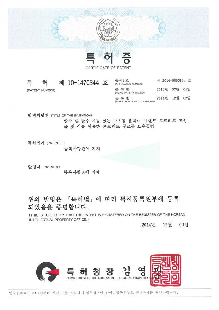특허증 제10-1470344호 Smart-Seal공법 페이지 정보 글쓴이 관리자 조회 586 등록일 time18-01-12 15:53 댓글 0건 관련링크 이전글 다음글 목록 답변 본문 특허증 제10-1470344호 Smart-Seal공법 이전글 다음글 목록 답변