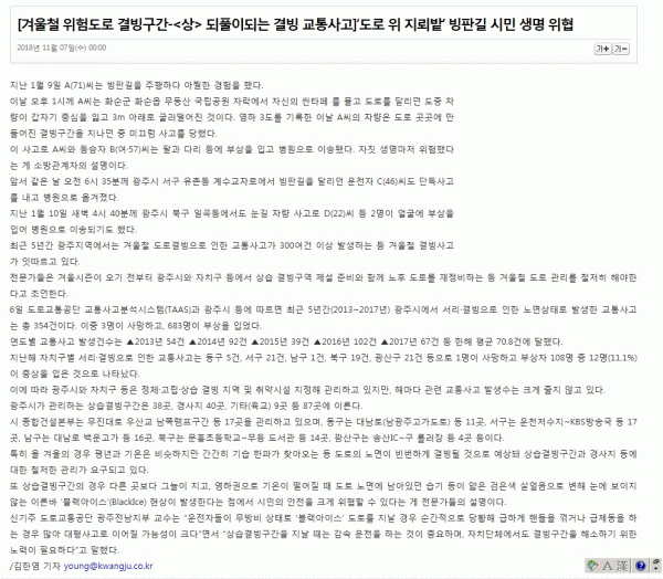 [겨울철 위험도로 결빙구간-<상> 되풀이되는 결빙 교통사고]`도로 위 지뢰밭`빙판길 시민 생명 위협 페이지 정보 작성자 dkeng 조회 2,409 등록일 time18-11-07 17:21 댓글 0건 관련링크 http://www.kwangju.co.kr/read.php3?aid=1541516400645501006&search=결빙 2054회 연결 이전글 다음글 목록 본문 [겨울철 위험도로 결빙구간-<상> 되풀이되는 결빙 교통사고]`도로 위 지뢰밭`빙판길 시민 생명 위협 이전글 다음글 목록