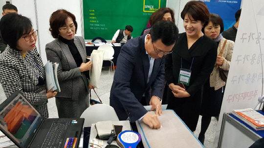 21일 열린 2018 광주우먼비즈페어에서 김진형 중소벤처기업부 광주전남청장이 ㈜다스리(대표 김연홍)가 생산한 '물로 쉽게 지워지는 아쿠아클린'소파 소재를 체험하고 있다.